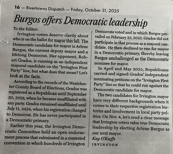 2) Arlene is a Democrat. We live in a terrifying time with authoritarianism in the federal government. As Irvington residents, we can control what happens in our village. We need a true Democrat as mayor, not someone who was a Republican until 2019 (well into the first Trump administration), registered as a Democrat in 2024, and did not take part in the Democratic nominating process for mayor. Arlene is pragmatic enough to work with the federal government when it suits Irvington, but she also will stand against the authoritarianism that most Irvington residents do not support.