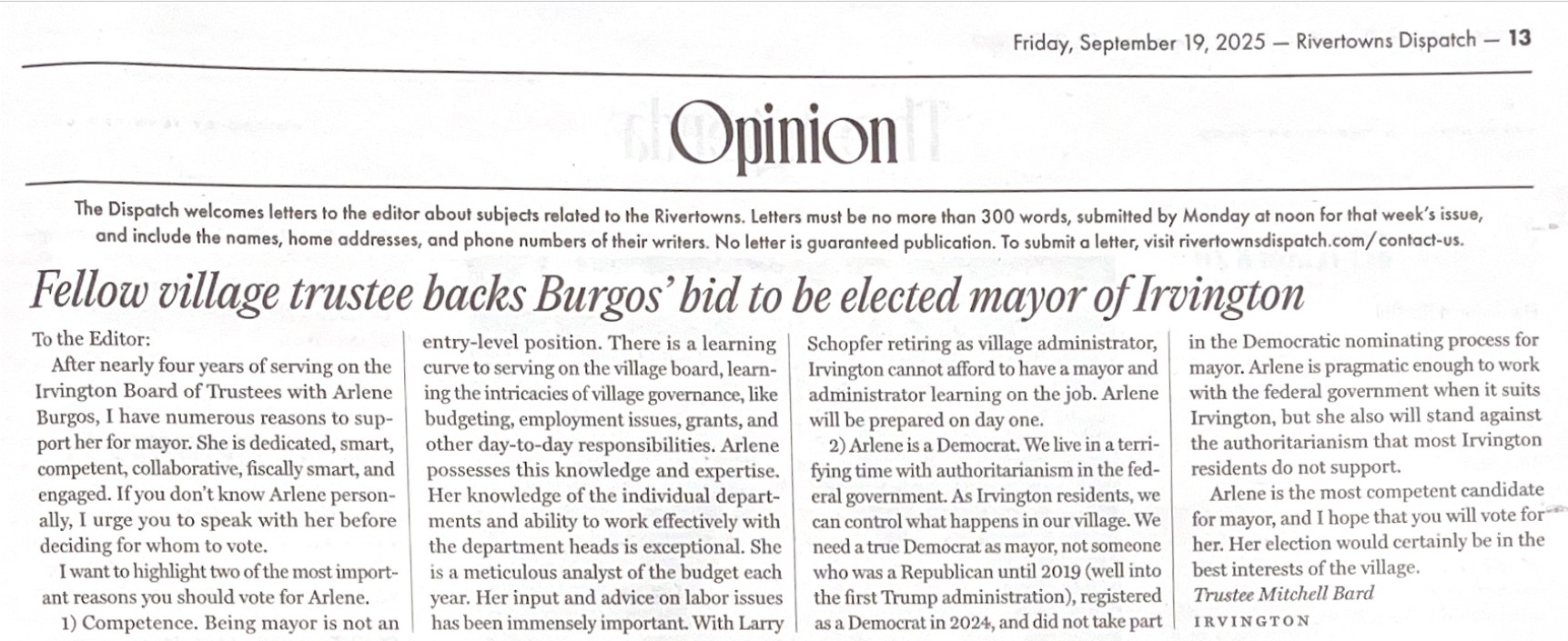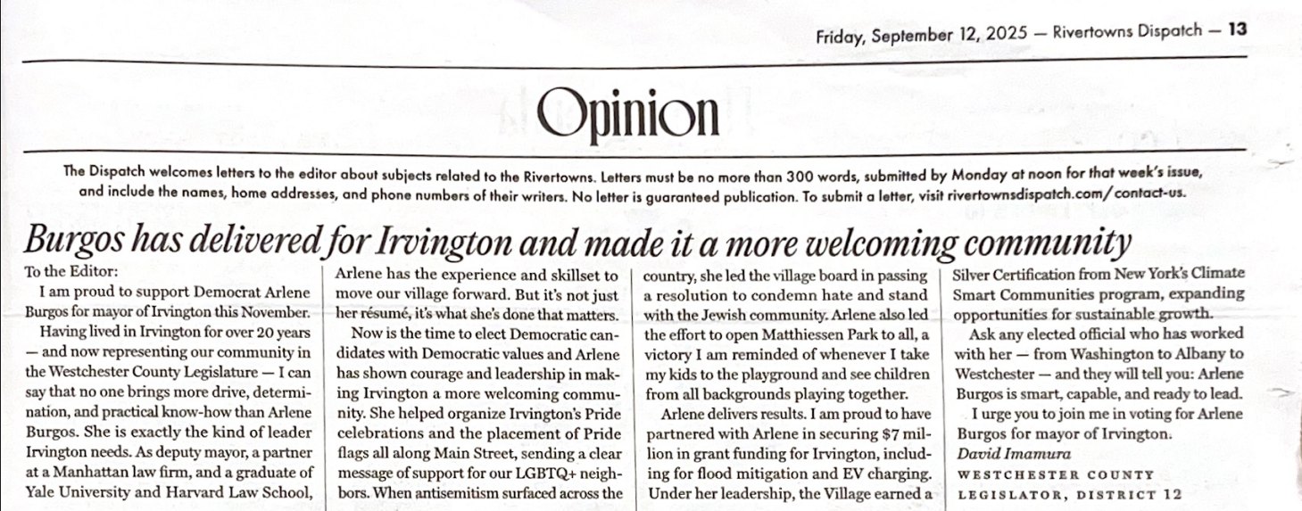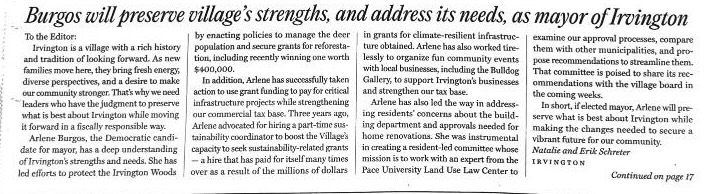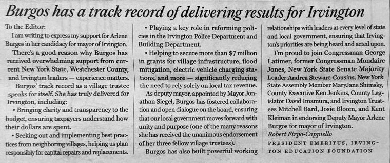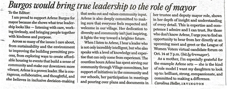 After nearly four years of serving on the Irvington Board of Trustees with Arlene Burgos, I have numerous reasons to support her for mayor. She is dedicated, smart, competent, collaborative, fiscally smart, and engaged. If you don't know Arlene personally, I urge you to speak with her before deciding for whom to vote.