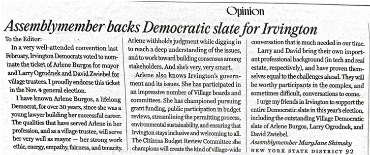 In a very well-attended convention last February, Irvington Democrats voted to nominate the ticket of Arlene Burgos for mayor and Larry Ogrodnek and David Zwiebel for village trustees. I proudly endorse this ticket in the Nov. 4 general election.
