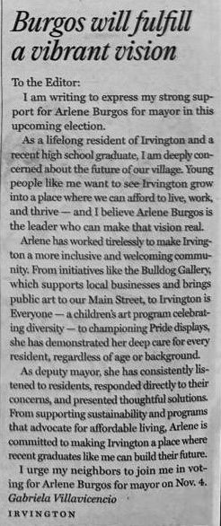 As a lifelong resident of Irvington and a recent high school graduate, I am deeply concerned about the future of our village. Young people like me want to see Irvington grow into a place where we can afford to live, work, and thrive - and I believe Arlene Burgos is the leader who can make that vision real.