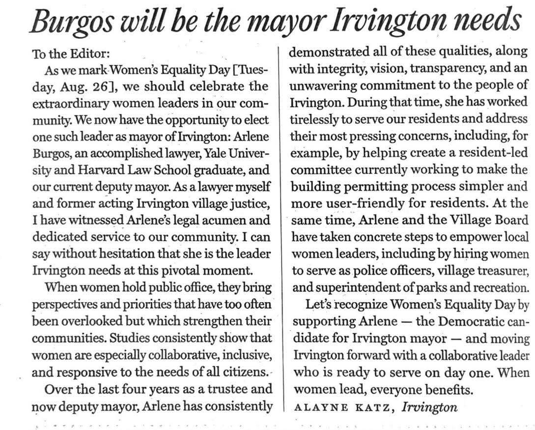As we mark Women's Equality Day [Tuesday, Aug. 26], we should celebrate the extraordinary women leaders in our community. We now have the opportunity to elect one such leader as mayor of Irvington: Arlene Burgos, an accomplished lawyer, Yale University and Harvard Law School graduate, and our current deputy mayor. As a lawyer myself and former acting Irvington village justice, I have witnessed Arlene's legal acumen and dedicated service to our community. I can say without hesitation that she is the leader Irvington needs at this pivotal moment.