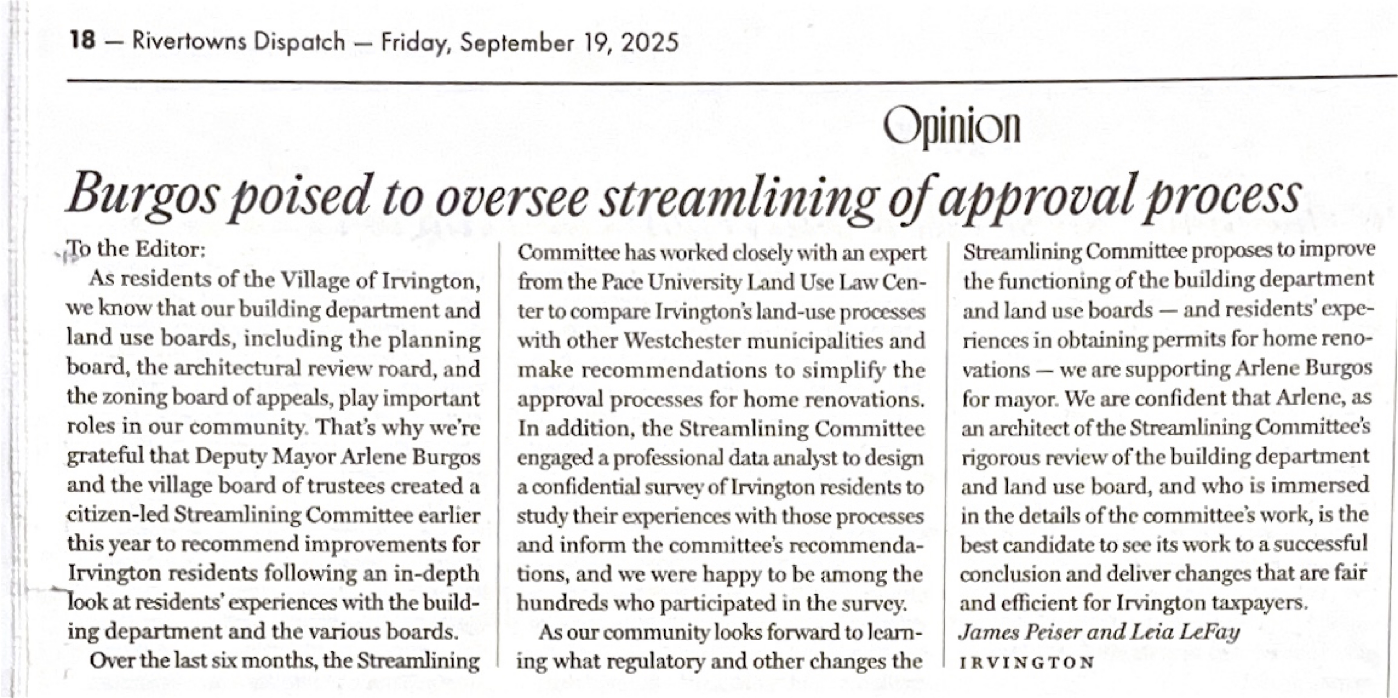 As our community looks forward to learning what regulatory and other changes the Streamlining Committee proposes to improve the functioning of the building department and land use boards — and residents' experiences in obtaining permits for home renovations - we are supporting Arlene Burgos for mayor. We are confident that Arlene, as an architect of the Streamlining Committee's rigorous review of the building department and land use board, and who is immersed in the details of the committee's work, is the best candidate to see its work to a successful conclusion and deliver changes that are fair and efficient for Irvington taxpayers.
