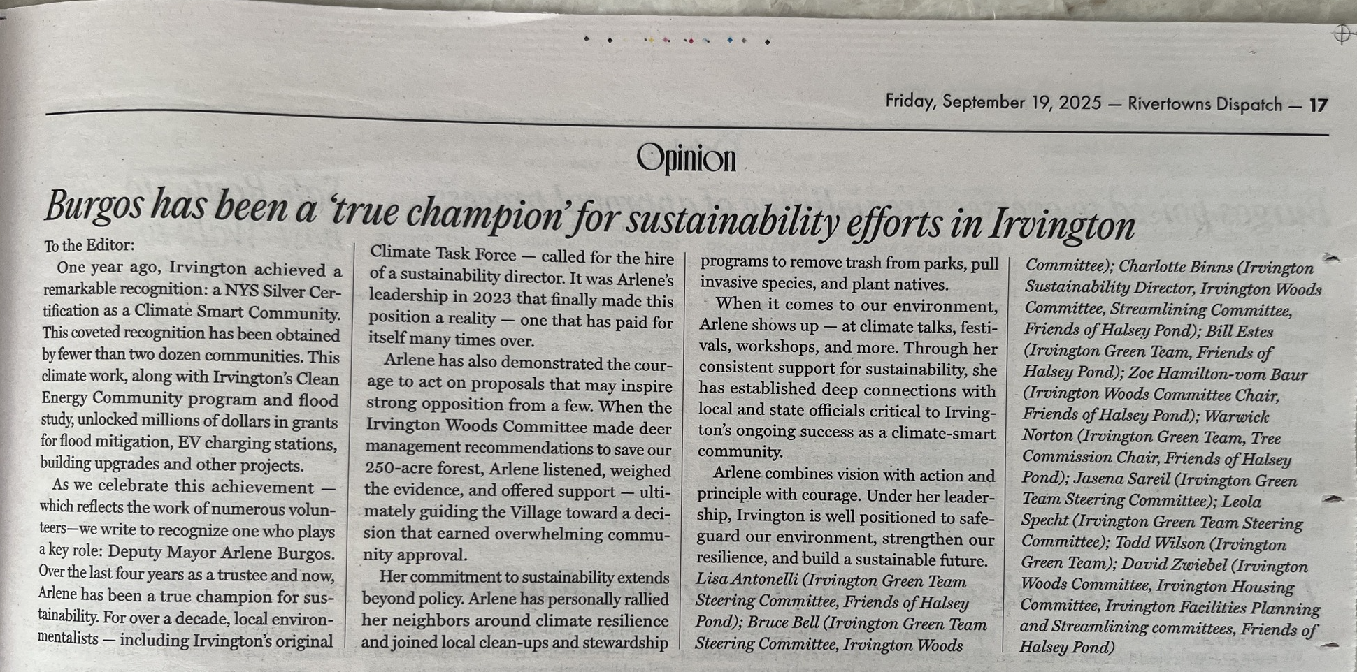 As we celebrate this achievement—which reflects the work of numerous volunteers—we write to recognize one who plays a key role: Deputy Mayor Arlene Burgos. Over the last four years as a Trustee and now Arlene has been a true champion for sustainability. For over a decade, local environmentalists—including Irvington’s original Climate Task Force—called for the hire of a sustainability director. It was Arlene’s leadership in 2023 that finally made this position a reality—one that has paid for itself many times over.